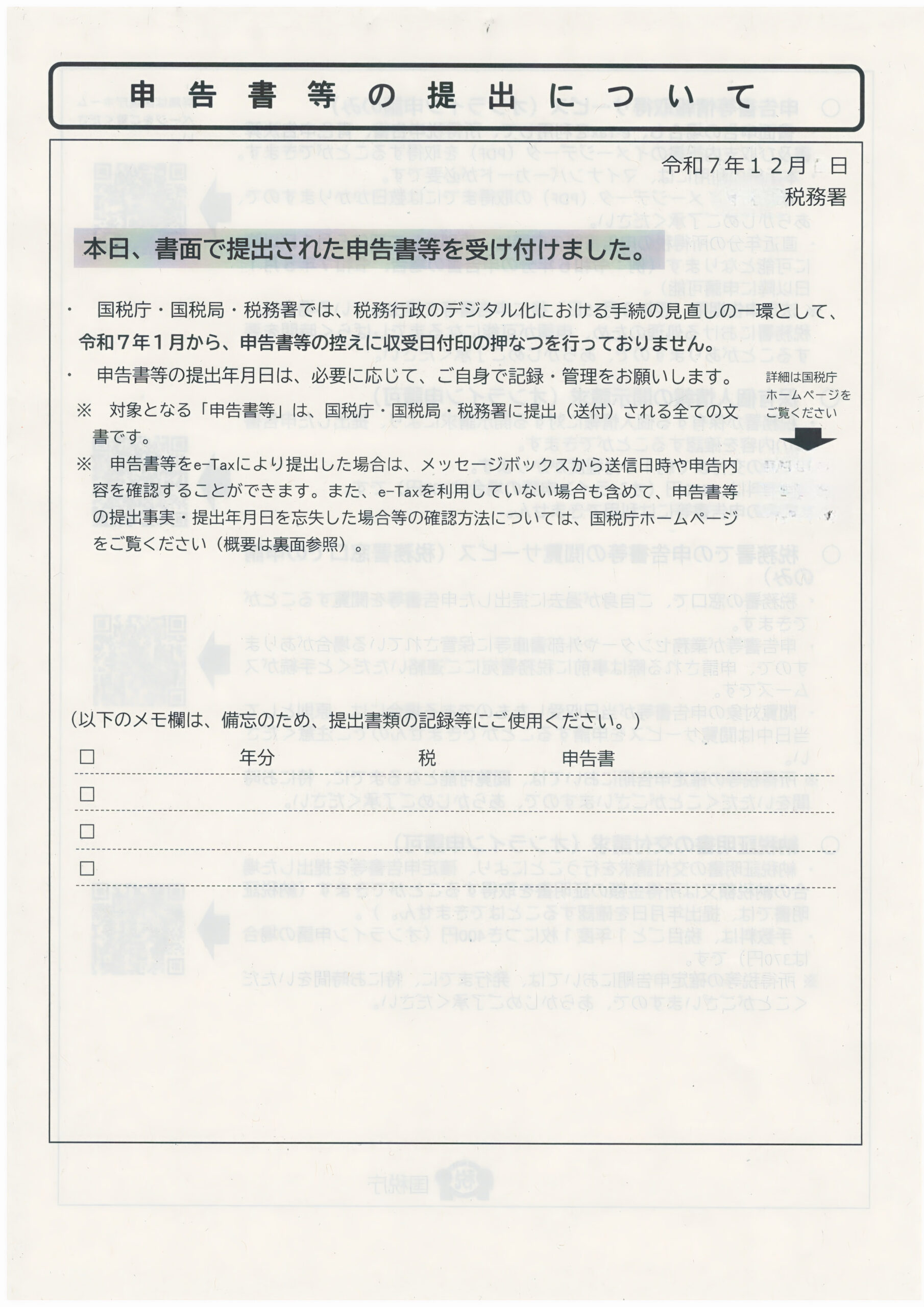 まあそれでも、大した労力ではないので良かったのだが、今年はついに確定申告書の「控え」に「税務署受領印」さえ押してくれなくなったのだ。